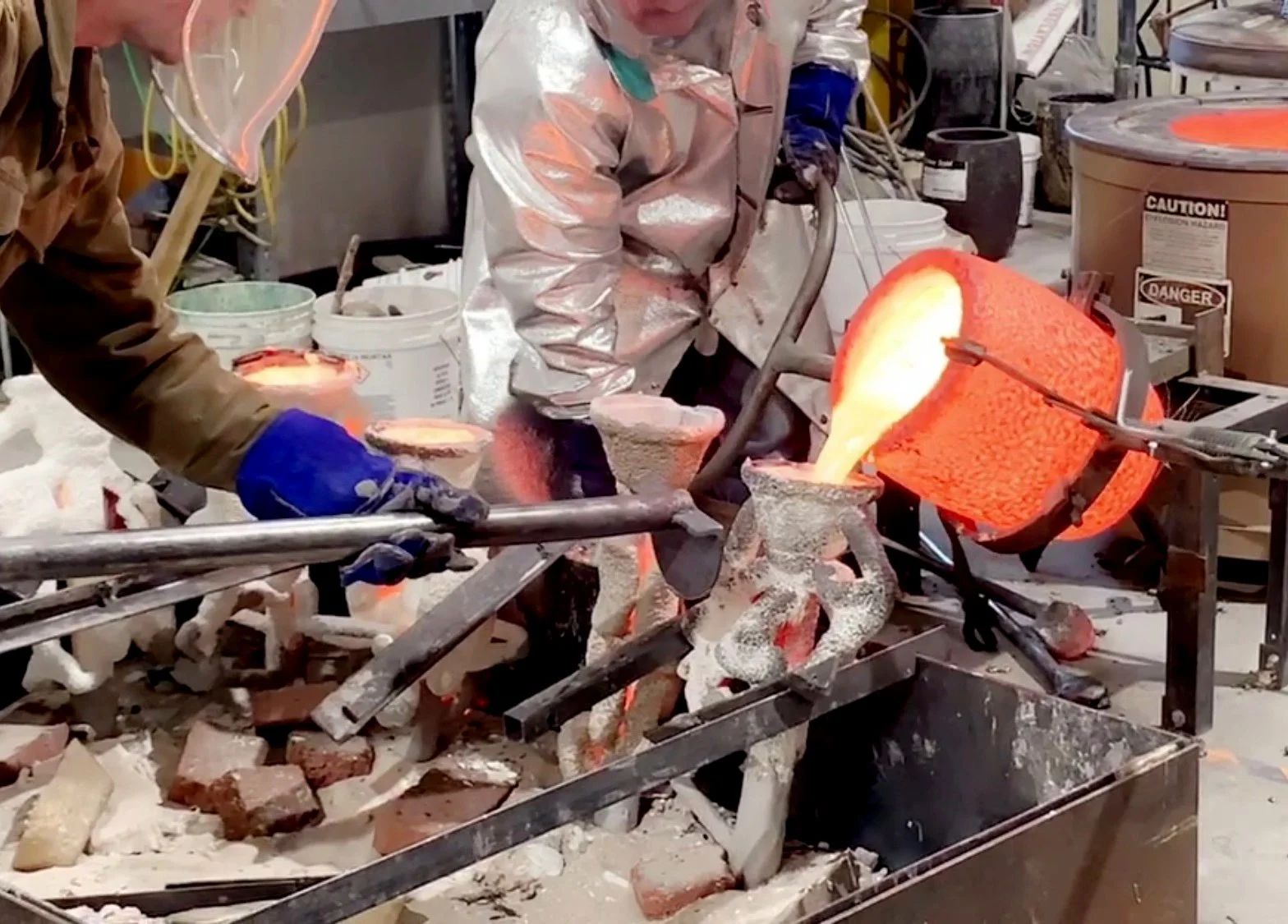 bronze melts around 1,742˚F (950˚C) but is usually poured around 1,800˚-2,000˚F. Once the tree has hardened and cooled, the outer Silica shell is broken and sand blasted off revealing the bronze casting. I then cut, grind and finish each piece with a variety of polishing, patina and electroplating techniques.