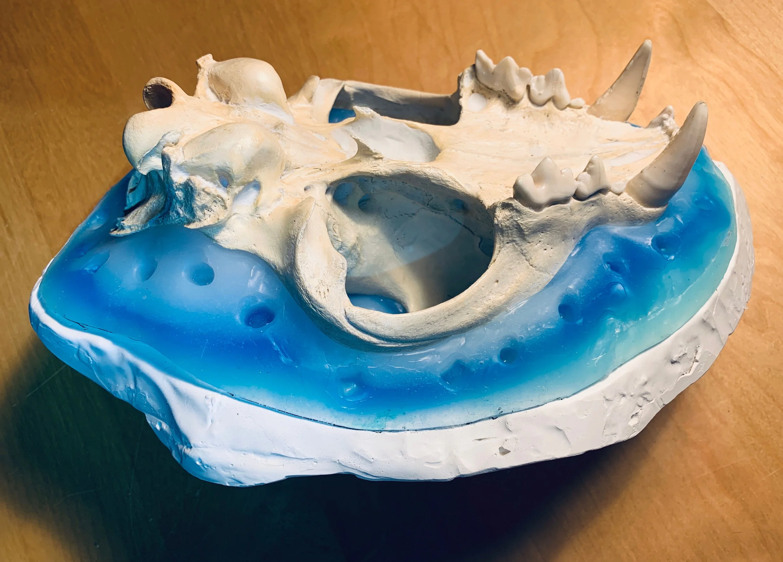Using bones I’ve found or have been given by others, I first make a silicone mold of the bone. Building up the silicone layers and Calculating division planes is different for each item. My process is unique in that the original skull remains fully intact and preserved.